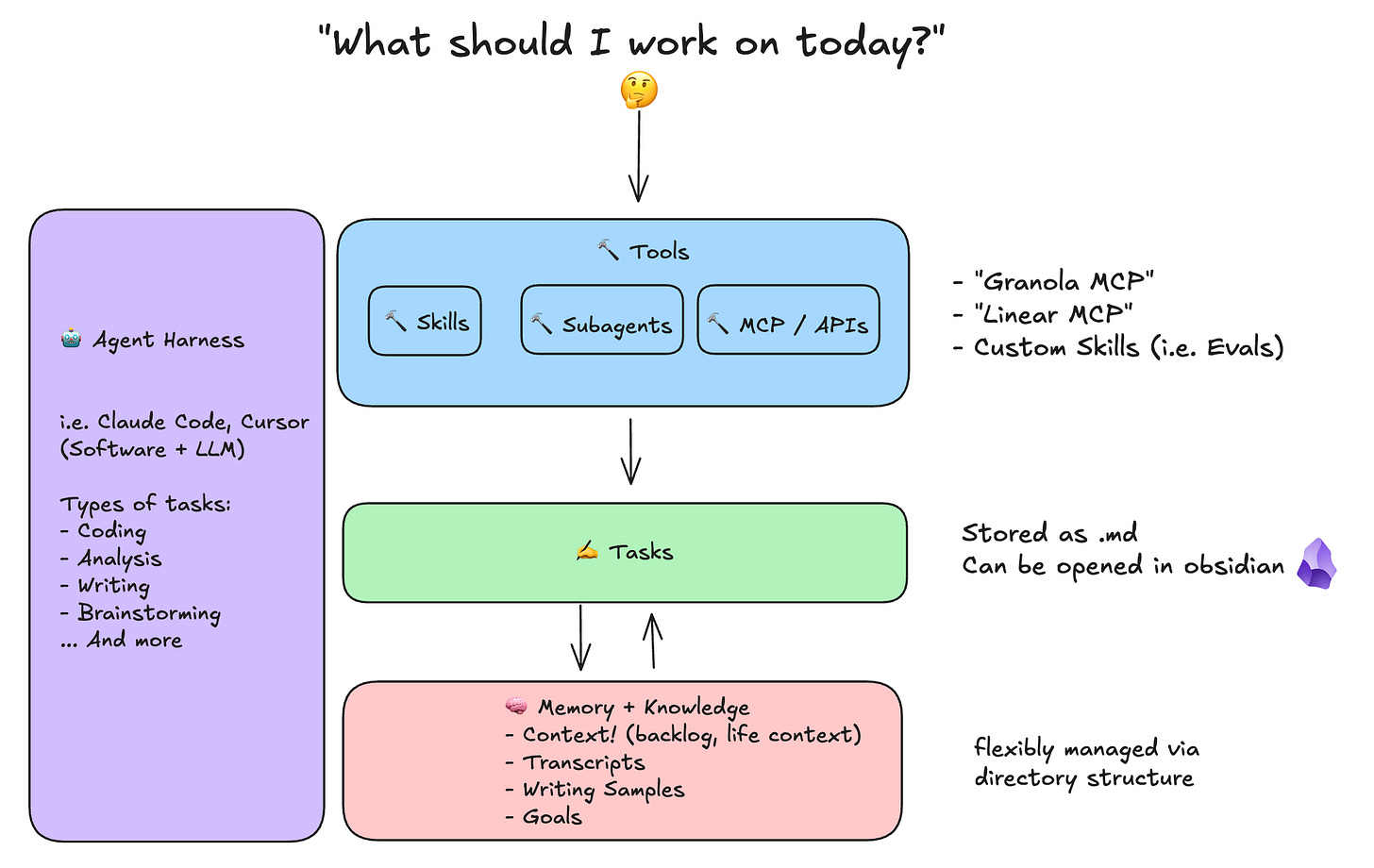 The compounding effect. None of this required Alex to explain context twice. The 1:1 prep knew David’s preferences because Knowledge/People/ exists. The PRD draft hit the right metrics because GOALS.md was up to date. The stakeholder update wrote itself because the workflow remembered the format and audience. Every file you maintain makes every future interaction smarter.