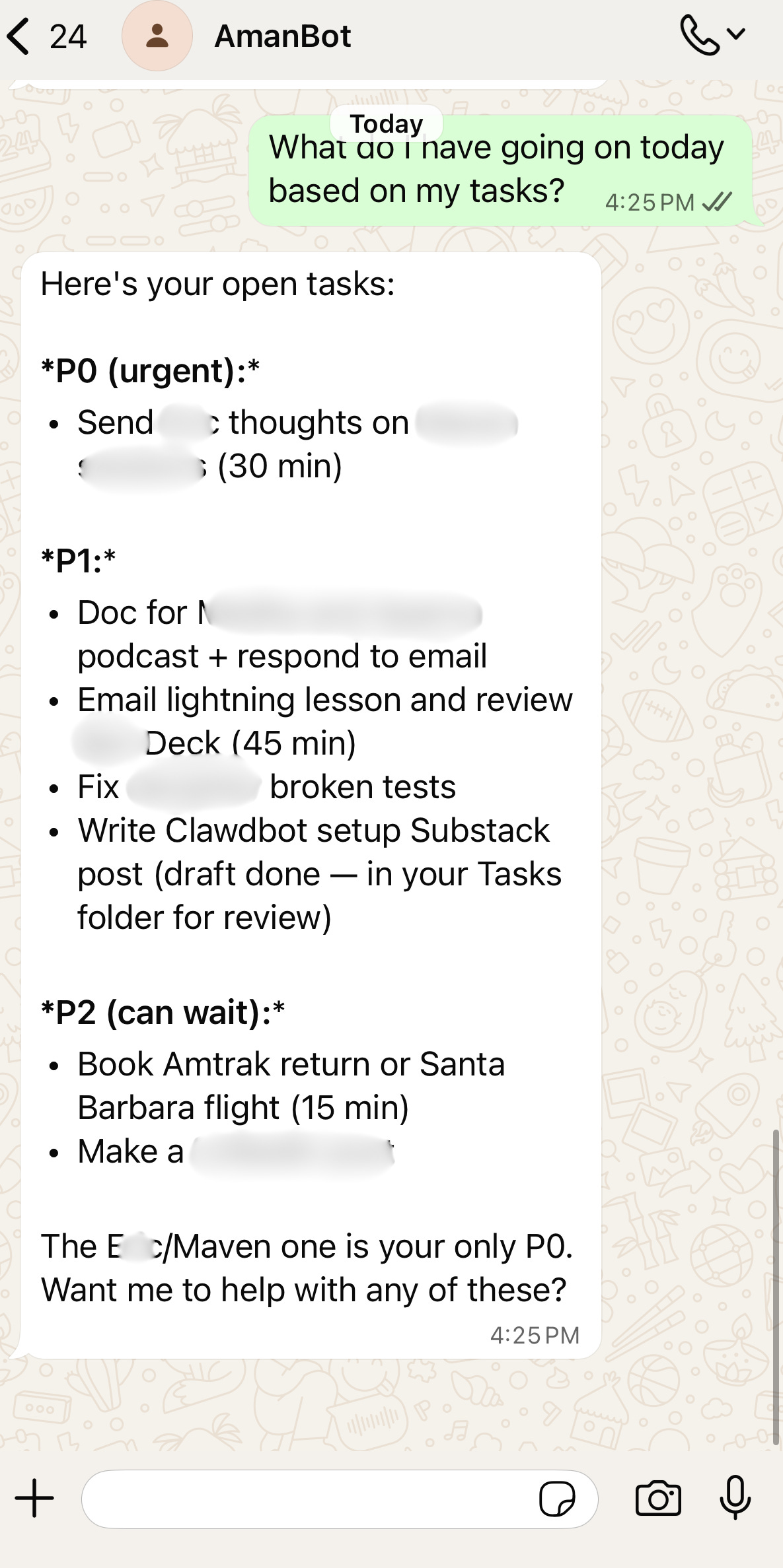 Using it to manage my personal operating system on my phone. I’ve been using this from Claude Code (terminal) directly for the past few months, but being able to interact with it from WhatsApp has been super powerful.